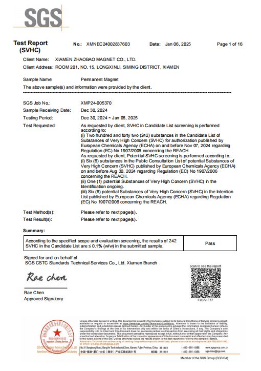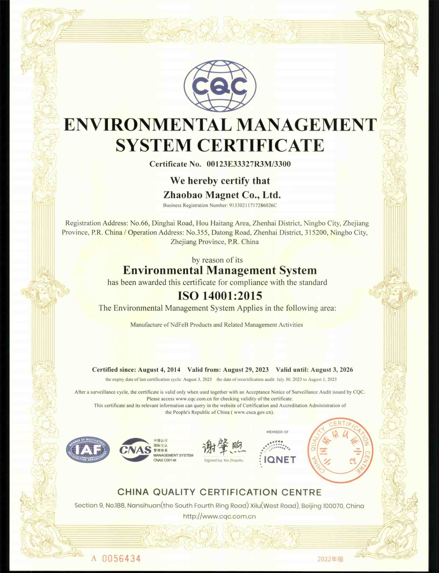 আমাদের নিওডিয়ামিয়াম চুম্বক পণ্যগুলি আন্তর্জাতিক মানগুলির সাথে সম্পূর্ণ সম্মতি ধারণ করে, IATF16949 (অটোমোটিভ শিল্প), ISO9001 (মান ব্যবস্থাপনা), ISO14001 (পরিবেশগত ব্যবস্থাপনা), ROHS, REACH, CE, CPC, EN71, ASTM এবং CHCC দ্বারা প্রত্যয়িত৷ এই সার্টিফিকেশনগুলি নিশ্চিত করে যে আমাদের নিওডিয়ামিয়াম চুম্বকগুলি কঠোর নিরাপত্তা, পরিবেশগত এবং কর্মক্ষমতার মানদণ্ড পূরণ করে, যা তাদের ইউরোপ, উত্তর আমেরিকা এবং দক্ষিণ-পূর্ব এশিয়ায় নিয়ন্ত্রক বাধা ছাড়াই রপ্তানির জন্য উপযুক্ত করে তোলে।